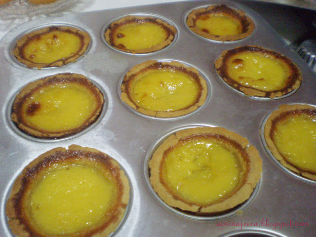 Lepas 10 minit pastri dalam oven tu, kita tuangkan kastard ni dalam tart shell tu then masukkan kembali ke dalam oven dengan suhu yang sama dalam masa 20 minit. Actually tak sure masa dia sebab mengikut owner, dalam masa 15 minit tapi dalam masa 15 minit, egg tart tak masak lagi juga. So kene selalu-selalulah jenguk oven anda ye. Bila dah kuning-kuning sikit tu dah masak lew tu.